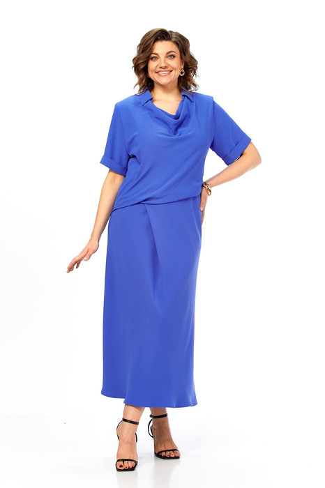 Платье женское длиной до середины икры, слегка расклешенное к низу. Спинка с косым передом в области талии и средним швом до разреза. Перед с косым подрезом в области талии, образующий мягкую складку из лифа и 1 глубокую складку от подреза вниз. Горловина с рубашечным воротником на стойке и драпировкой в виде качели. Рукав втачной с отложными манжетами.