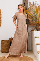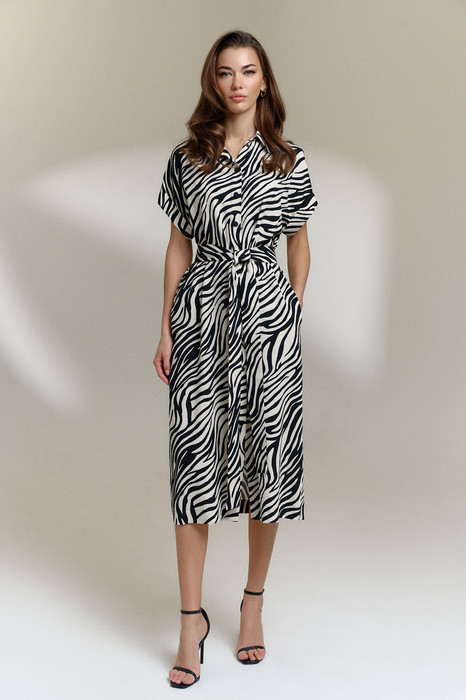 Платье женское прямого силуэта, имеется пояс-завязка из основной ткани. В боковых швах выполнены боковые карманы. Воротник отложной на стойке. Рукав короткий, спущенный, цельнокроенный с притачной отложной манжетой. Застежка в платье на цельнокроенных планках через пробивные кнопки. Низ изделия обработан широкой подгибкой со швом с закрытым срезом.