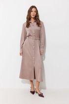 Платье женское силуэта " Трапеция" из легкой плательно-блузочной ткани. В боковых швах выполнены потайные карманы, обратотка пройм и горловины на обтачке. Декоративные пряжки заведены в брители из плотной тесьмы, закрепленные по полочке пробивными кнопками.