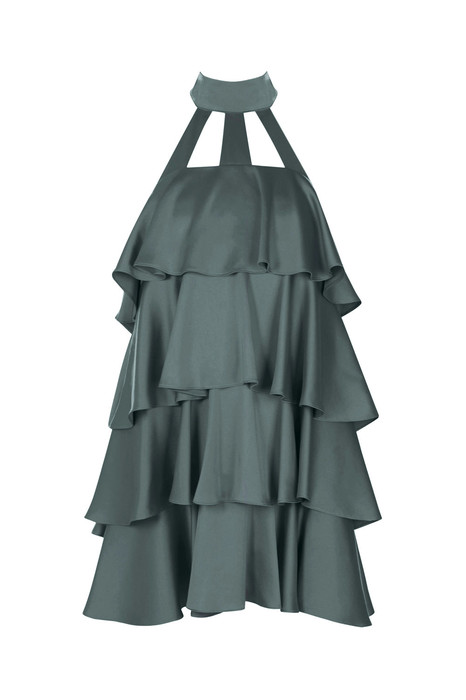 Платье женское на подкладке, А-силуэта, длина мини. На спинке и переде воланы в 4 яруса. Горловина- стойка, застегивается на 3 навесные петли и пуговицы. На спинке перекрестные бретели.