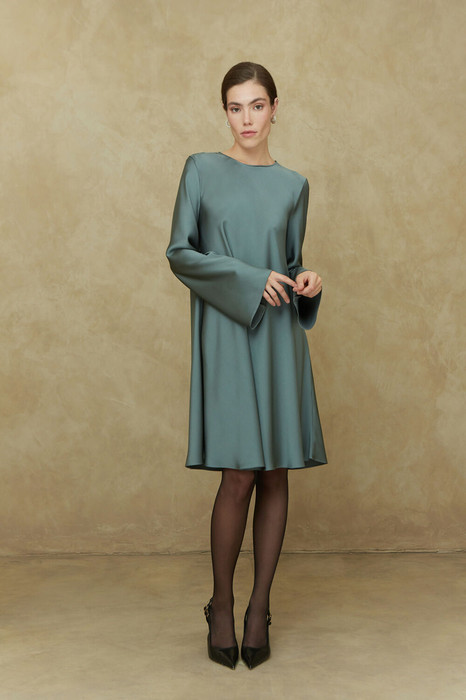 Платье женское расширенное к низу, длиной ниже колена. По спинке застежка на 1 петлю и пуговицу. Рукава длинные, втачные.