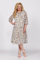 Платье женское полуприлегающего кроя, выполнено из шифоновой ткани. Изделие отрезное по линии талии, рукав втачной короткий, низ рукава обработан эластичной тесьмой. Горловина по лифу фигурная, По спинке платья имеется вставка из сетки и вырез "капелька". Платье на подкладке.