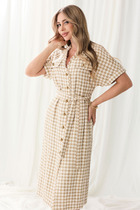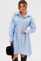 Платье женское повседневное полуприлегающего силуэта с фигурным низом расширенное к низу, выполнено из плательной ткани. Вырез горловины воротник «стойка», рукав втачной 7/8 по низу на притачной манжете собран на сборку. В рукаве отделочная пата которой можно регулировать длину рукава и делать короче. В боковых швах обработаны карманы и разрезы . По переду застежка до талии на обметанные петли и три отделочных пуговицы, по спинке фигурная кокетка и встречная складка. Платье расширено к низу за счет складок по переду. Декором служит отделочная нашивка по спинке и декоративные пуговицы по переду и рукавам.