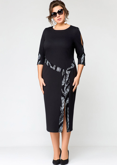Платье женское нарядно-повседневное прилегающего силуэта выполнено из трикотажного полотна в сочетании с отделкой. Вырез горловины лодочкой, рукав втачной 3/4 по центру с отделочным элементом. По полочке нагрудные вытачки и ассиметричные вставки из отделочного трикотажа, разрез обработан с левой стороны, по спинке центральный шов и потайная застежка молния. Декором платья служит отделочные вставки по рукавам и переду платья .