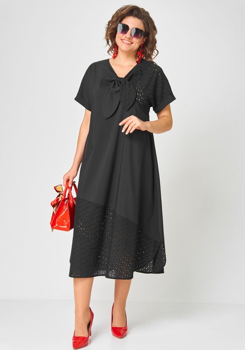 Платье женское стильное нарядно повседненое шикарное элегантное выполнено в сочетании дорогого хлопка и шитья. Вырез орловины V-образный переходящий в ассиметричные завязки в виде банта. Рукав спущенный по низу на притачной манжете, в боковых швах обработаны разрезы, низ фигурный стильный шикарный из шитья придет изделию эффект легкости и элегантности. Декором платья служат вставки из шитья.