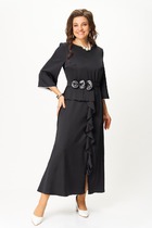 Женское платье из однотонной ткани для повседневной носки. Платье прямого силуэта, со спущенной линией плеча, и проймой, переходящей в подрез треугольной формы. Перед лифа состоит из двух частей: горизонтальной кокетки и нижней части. Застёжка на тесьму-молнию в центральном шве переда. Спинка платья состоит из двух частей: горизонтальной кокетки и нижней части, в среднем шве спинки обработана шлица. Модель дополнена съемным поясом.