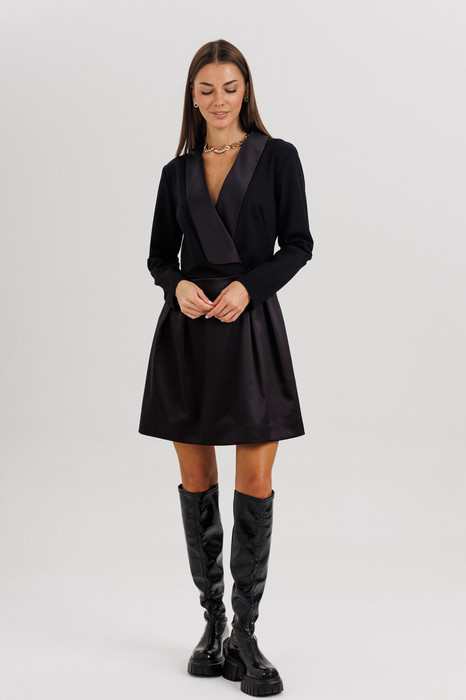 Лиф платья выполнен с талиевыми и нагрудной вытачкой, обеспечивая идеальную посадку, а юбка из гладкого атласа с мягкими складками создаёт лёгкий объём и женственный силуэт. На спинке — застёжка на отделочную молнию, добавляющая современный штрих.