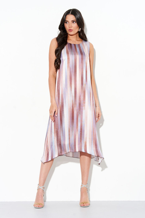 Платье прямого силуэта из плательного сатина на подкладке с антистатическим эффектом, вырез горловины округлой формы; низ платья ассиметричный. Рекомендована стирка при t не выше 30 С, Глажение при t прессующей поверхности не выше 110 С.