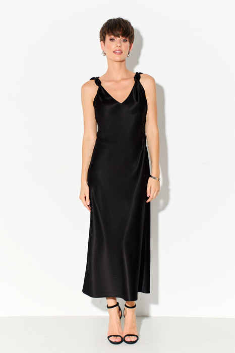 Платье - комбинация длины миди полуприлегающего силуэта выполнено из струящегося шелк - сатина с декоративными регулирующими узлами, в боковой шов вставлена потайная молния. Платье полностью соответствует  заявленному размеру. Пожалуйста, пользуйтесь таблицей обмеров готового изделия.