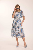 Платье женское прямого силуэта, длиной до середины колена. Рукав рубашечного покроя, длинный. Линия плеча немного спущена. Платье выполнено из трикотажного мягкого полотна, с хорошей растяжимостью.Членения спинки и переда ассиметричные. Горловины круглая, обработана узкой бейкой. В нижней части переда слева расположено пришивное украшение— апликация.