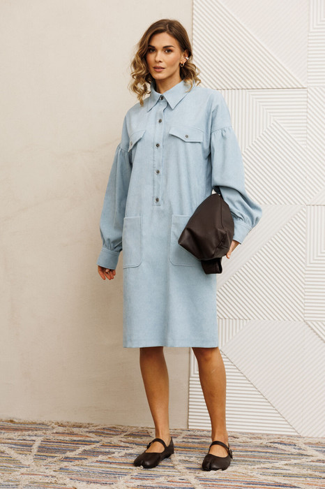 Платье прямого кроя из вельветовой ткани. Перед с застежкой "поло". Воротник на стойке. В районе бедер настрочные карманы, в районе груди настрочные клапаны. Рукав со спущенным плечом, втачной, со сборкой по окату и в месте притачивания манжеты. Манжета с застежкой на 2 петли и пуговицы. Фурнитура может быть изменена с сохранением художественного образа.  Длина платья - 92 см, длина рукава платья - 51см.