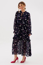 Платье прямого силуэта. Перед с нагрудными вытачками. Спинка со средним швом. Горловина лодочкой обработана планкой. Рукав одношовный втачной по низу со складками собранными на манжету-довяз.  Длина платья-100см, длина рукава-60см.