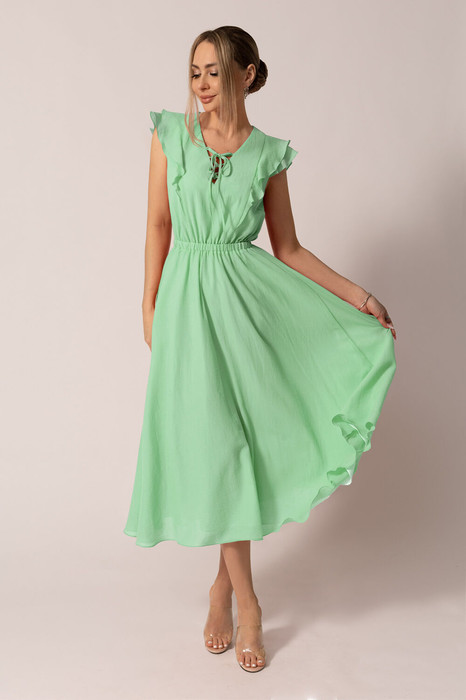 Платье полуприлегающего силуэта, без воротника с фигурным вырезом горловины. Лиф переда с кокеткой, клапанами, выходящими из кокетки. Лиф переда и спинки с рельефами и рюшами, выходящими из плеча. Платье без рукавов, с крылышком. По талии втачной пояс, присборенный на резинку. По горловине переда- шнур-завязка, закрепленная на навесные петли.