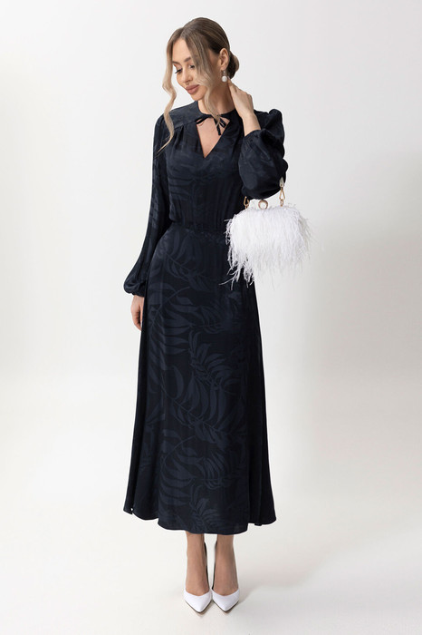 Платье полуприлегающего силуэта, с застежкой на потайную молнию в левом боковом шве, без воротника, с круглым вырезом горловины. Горловина переда со шнуром- завязками. Платье отрезное по линии талии. Шов по талии присборен на резинку. Верхняя часть переда с фигурной кокеткой, переходящей на спинку. По шву притачивания кокетки- сборка, по верхней части переда- V-образный вырез. Рукав втачной, длинный, с отрезной манжетой. Окат рукава присборен. Манжета присборена на резинку.