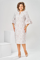 Платье расширенного к низу силуэта, без воротника, с V-образным вырезом горловины, застежкой на потайную молнию в среднем шве спинки. Платье отрезное по линии талии. Лиф переда со средним швом и талиевыми вытачками. Нижняя часть переда с кружевными вставками. . Спинка со средним швом. Верхняя часть спинки с талиевыми вытачками, нижняя часть спинки с рельефными швами. Рукав втачной, короткий, крылышко.