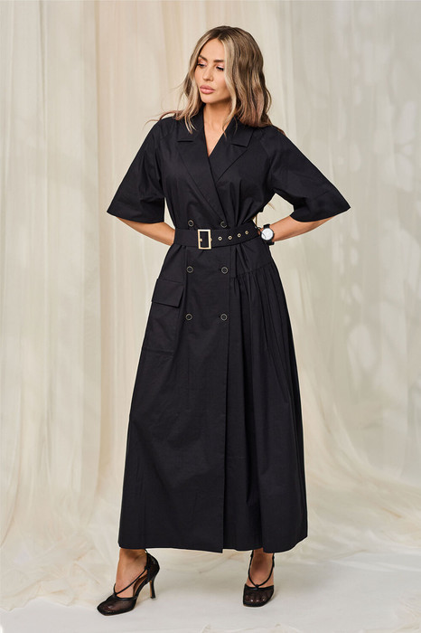Платье с центральной двубортной застежкой, втачным воротником и отложными лацканами. Платье подрезом по спинке и правой полочке. По шву подреза нижняя часть платья присборена. По правой полочке- на уровне бедер расположен накладной карман с клапаном. Верхняя часть спинки с отлетной кокеткой. Рукав реглан, короткий. Платье со съемным поясом.