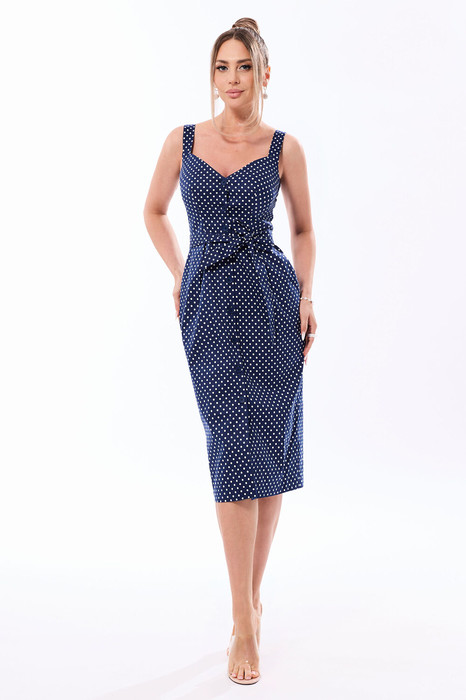 Платье с центральной застежкой на петли и пуговицы, на широких бретелях. Платье отрезное по линии талии. Верхняя часть переда с талиевыми вытачками, нижняя часть переда с карманами и односторонними складками по талии. Нижняя деталь спинки с талиевыми вытачками. Платье со съемным поясом.