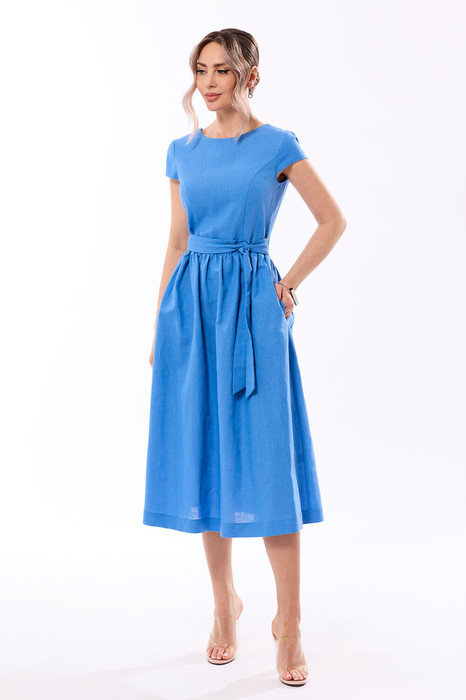 Платье полуприлегающего силуэта, с круглым вырезом горловины, без воротника, застежкой на петли и пуговицы по спинке. Платье отрезное по линии талии, с втачным поясом. Верхняя часть переда с рельефами, выходящими из проймы. Верхняя часть спинки с талиевыми вытачками, фигурным вырезом горловины и фигурным вырезом по низу, застежкой на две петли и пуговицы. Нижняя часть платья со сборкой по шву притачивания к поясу. Рукав втачной, короткий, крылышко. В боковых швах расположены карманы.