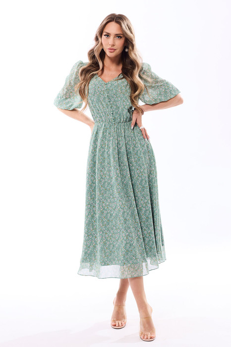 Платье без воротника, с V-образным вырезом горловины. Платье отрезное по линии талии. Верхняя часть переда со средним швом, нагрудными вытачками. Верхняя часть спинки с цельная. Нижняя часть платья расклешенная. Шов по талии присборен резинкой. Рукав втачной, 3/4, с отрезной манжетой. По шву притачивания манжет- сборка. Окат рукава присборен. Манжета присборена резинкой.
