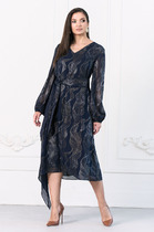 Платье, без воротника, с круглым вырезом горловины, застежкой на потайную молнию в среднем шве спинки. По переду с нагрудными вытачками. Спинка со средним швом, талиевыми вытачками. Правый боковой шов с разрезом. Рукав втачной, длинный. Платье со съемным поясом-сумкой.