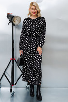 Платье, без воротника, с круглым вырезом горловины, застежкой на навесную петлю и пуговицу и потайную молнию в среднем шве спинки. Платье отрезное по линии талии, шов по талии присборен на резинку. Верхняя часть переда по горловине присборена. Спинка со средним швом. Рукав втачной, длинный, с отрезной манжетой. Планка горловины и манжета имеют форму валика. Платье со съемным поясом.