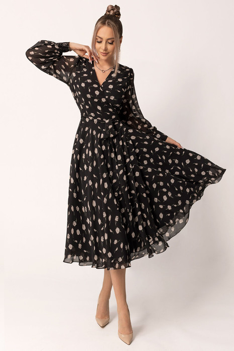 Платье без воротника, без застежки, полочки зафиксированы поясом- завязкой, на уровне груди полочки зафиксированы пришивной кнопкой. Платье отрезное по линии талии. Верхняя часть полочек с нагрудными вытачками. Верхняя часть спинки с талиевыми вытачками. Нижняя часть платья расклешенная. Рукав длинный, с отрезной манжетой. Окат и низ рукава присборен. Платье со съемным поясом.