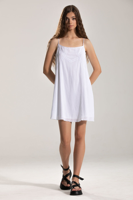 Платье A-образного силуэта, без рукавов, без застежки, на бретелях. Длина бретелей регулируется. Перед состоит из втачных фигурных деталей с кружевом. Спинка со средним швом. Платье на подкладке.