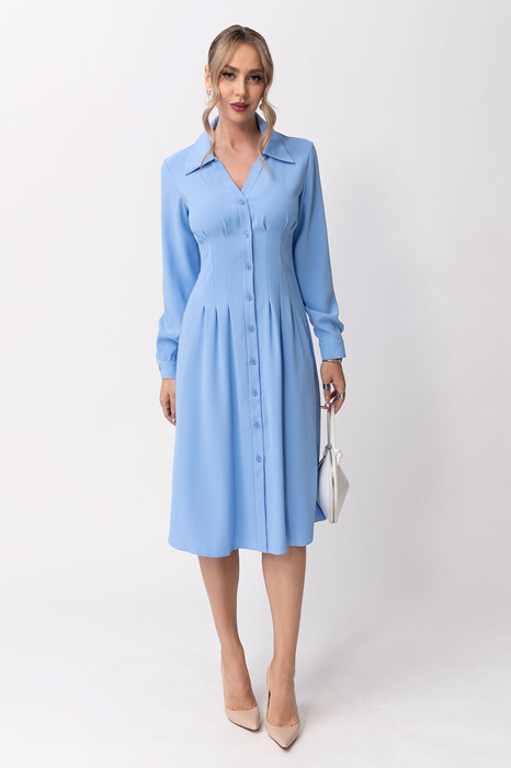 Платье с отложным воротником, центральной застежкой на петли и пуговицы по планке, с V-образным вырезом горловины. Полочки с тремя стачными односторонними складками. По спинке шесть стачных односторонних складок. Рукав втачной, длинный, с отрезной манжетой.
