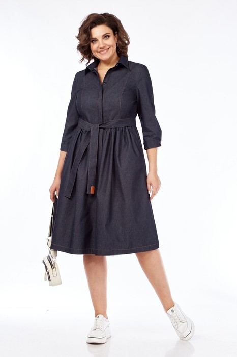 Элегантное женское платье полуприлегающего силуэта, классической длины, отрезное по линии талии со сборкой, изготовлено из хлопковой джинсовой ткани. Горловина оформлена рубашечным воротником со стойкой, центральная потайная застежка планки на петли-пуговицы. Перед изделия с рельефами в верхней части и боковыми карманами по юбке, спинка с талиевыми вытачками. Рукава с цельнокроенным манжетом и декоративными пуговицами контрастного цвета. Можно снять пуговицы и ширина рукава по низу увеличится на 3см. В комплекте идет пояс из основной ткани. Платье будет комфортно для любого типа фигуры. Длина рукава – 46см, длина изделия – 103см.