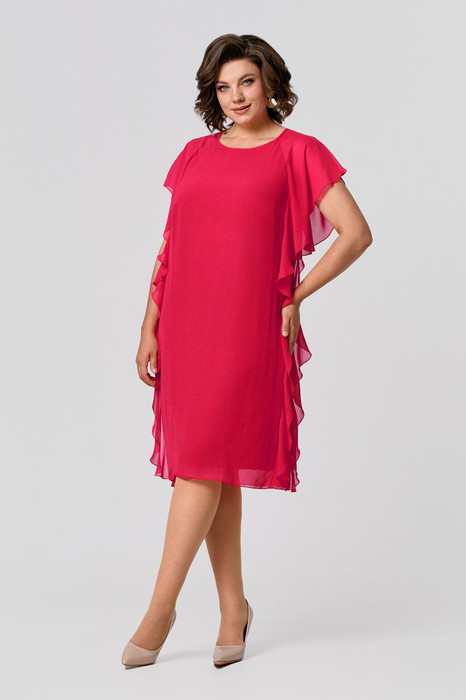 Платье женское прямого силуэта из легкой шифоновой ткани на подкладке из трикотажного полотна с антистатическим эффектом; рукава реглан, переходящие в декоративные воланы по переду и спинке.                                                                                                              Рекомендована стирка при t не выше 30 С, глажение при t  прессующей поверхности не выше 110 С. Длина 103 см.