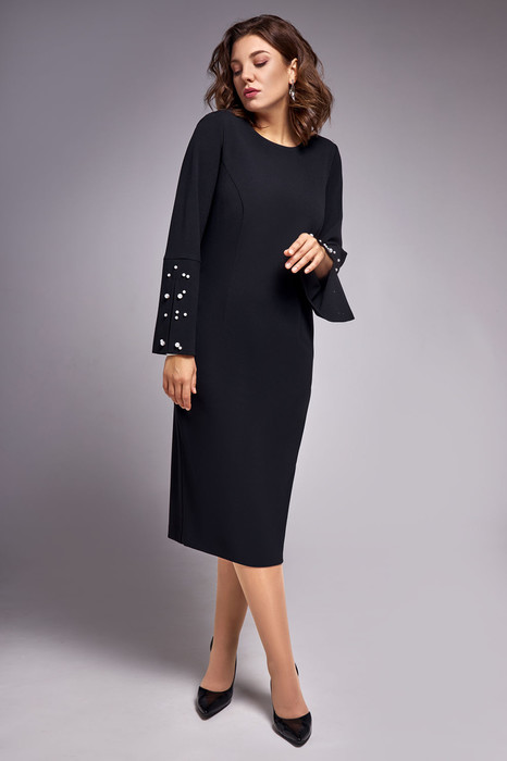 Платье женское полуприлегающего силуэта, по спинке застежка-молния и разрез; рукава втачные, по низу рукавов притачная манжета с разрезом и декором из бусин - жемчуга.