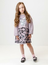 Платье коктейльное для девочки А-образного силуэта, средней длины, с втачными короткими рукавами на манжетах с круглым вырезом горловины. Полочка и рукава из нарядной ткани с пайетками на подкладке из кулирного полотна. Боковые швы платья декорированы ши