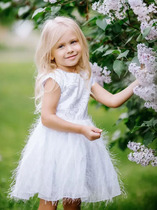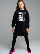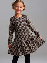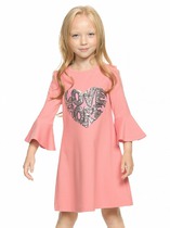 Платье для девочки прямого силуэта, средней длины, с длинными втачными рукавами, с круглым вырезом горловины, отрезное по линии талии. Линия талии занижена. Юбка платья плиссированная.