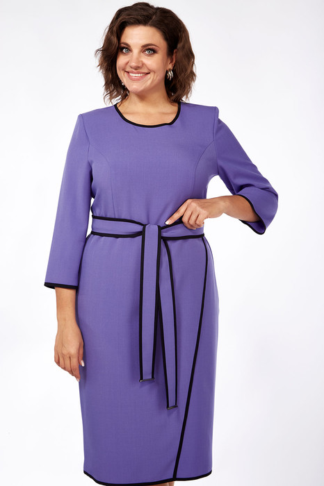 Платье женское прямого силуэта из плательной ткани. Горловина круглой формы. По переду рельефы, отрезное по талии, по юбке элемент запаха. По спинке средний шов, по горловине разрез с застежкой на потайную петлю и пуговицу. Отделка в виде окантовки горловины, низа рукавов, отлетных деталей юбки. В съемный пояс с зажимами на концах.