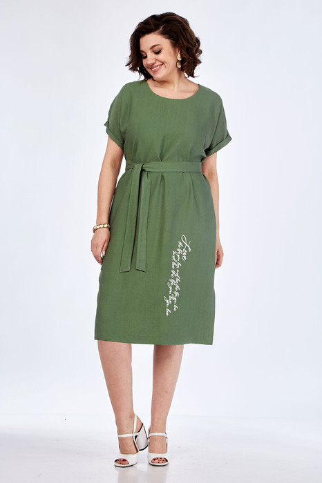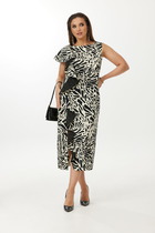 Платье женское прямого силуэта из плательной ткани. По переду нагрудные вытачки. Внизу-печать. По спинке фигурный вырез, складки и печать по центральной детали. В боковых швах карманы и разрезы внизу. Горловина круглой формы. Рукав спущенный с притачной манжетой.