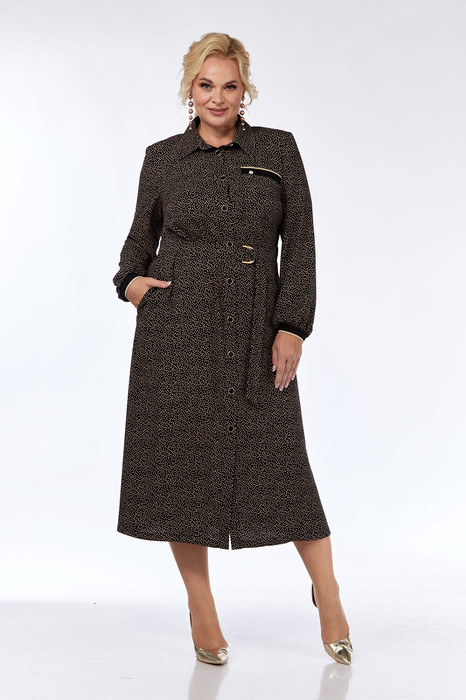 Платье женское А — силуэта, выполнено из неплотной плательной ткани. Воротник стояче — отложной с отрезной стойкой. Застежка центральная с притачной планкой на петли и пуговицы. По переду нагрудный накладной карман, с отделочной планкой из довяза. Спинка со средним швом. Рукава втачные, одношовные, длинные по низу присобраны на декоративный довяз. В боковых швах обработаны карманы. Имеется пояс из основной ткани с декоративной пряжкой.