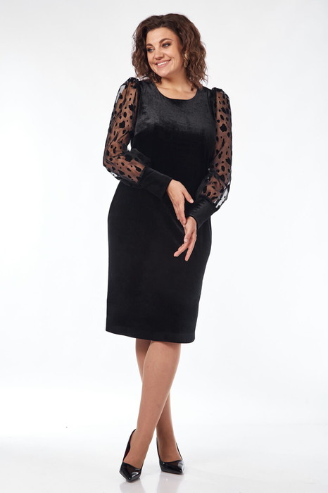 Платье женское, нарядное, изготовлено из велюра на трикотажной основе и органзы с флоком, полуприлегающего силуэта. Горловина обработана декоративной тесьмой. Перед с нагрудными вытачками. Спинка со средним швом, в котором обработаны шлица и застежка на навесную петлю и пуговицу. Линия плеча заужена. Рукав втачной широкий на манжете.. Платье на подкладке.