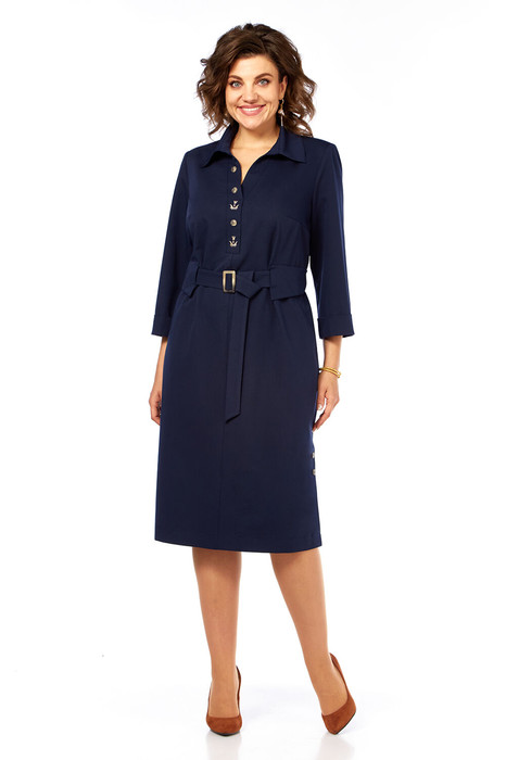 Платье  женское прямого силуэта, изготовлено из плательной ткани. По переду нагрудные вытачки и фигурные подрезы с карманами в швах. Горловина оформлена планками с декоративной вышивкой и пуговицами, воротник стояче-отложной. На талии декоративные шлевки и съемный пояс с пряжкой. По спинке кокетка и средний шов. В боковых швах внизу обработаны шлицы декорированы пуговицами.