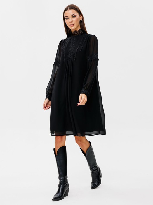 Платье А-силуэта с воротником стойкой. Платье двухслойное, нижний слой из ткани-компаньона. По переду платья декоративные складки и кружево. Рукав втачной длинный , декорирован кружевом, по низу обработан притачным манжетом с кружевом с застежкой на пуговицы. Спинка со средним швом с застежкой на пуговицы.