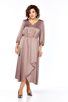 Платье женское прямого силуэта без подкладки из трикотажной ткани длиной до середины икры. Передняя часть платья со средним швом. По левой половинке переда внизу платья пришит волан из ткани – компаньона. По правой половинке переда настрочен нагрудный карман из ткани – компаньона с декоративными элементами. В боковых швах платья функциональные карманы. Спинка платья со средним швом, в котором расположена застежка – «молния». По низу левой половинки спинки пришит волан из ткани – компаньона. Горловина имеет округлую форму. Линия плеча спущена. Рукав выполнен из ткани – компаньона со сборкой вверху рукава и резинкой по низу рукава.