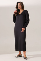 Платье прилегающего силуэта из трикотажного полотна с длинным рукавом и плечевыми накладками. По переду отрезана кокетка с небольшим вырезом над грудью. Платье отрезное по талии с потайными молниями по бокам, которые можно расстегнуть и придать платью более раскрепощённый вид. Сзади платья высокая шлица и застёжка на потайную молнию.