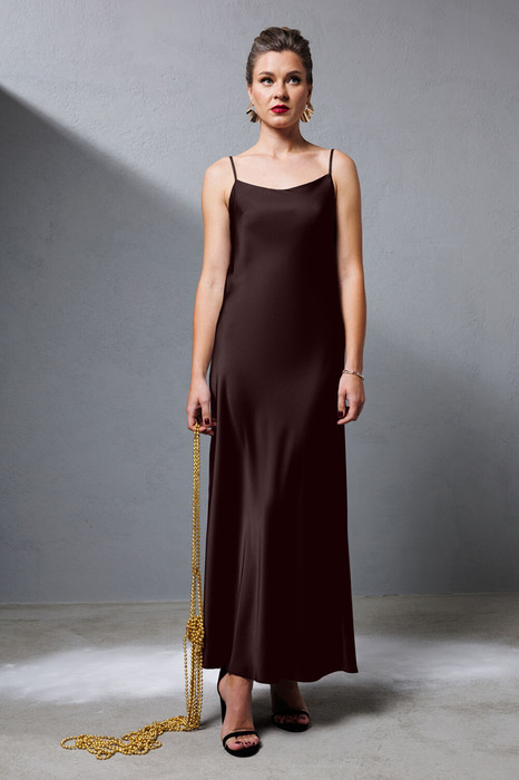 Платье сорочка прилегающего силуэта по груди и талии и с расширением к низу. Платье на бретелях, длина бретели регулируется. Платье выполнено из плотного струящегося атласа. Длина платья с бретелью - 136 см.