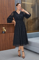 Классическое черное платье  А- образного силуэта  с изысканным V-образным вырезом на груди, длиной до колена, что делает его прекрасным выбором для особых мероприятий. Рукав и вставки по полочке сделаны из сетки с пайетками, добавляя изысканности и блеска этой модели. Это вечернее платье станет идеальным выбором для особых событий и подчеркнет вашу неповторимую индивидуальность.