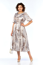 Платье женское, повседневное, на подкладке,свободного силуэта, расширенное книзу, длиной ниже коленей, с втачными рукавами, со съемным поясом. Вырез горловины детали переда платья «V-образной» формы, по центру обработана складка. По плечевым швам обработана сборка. Рукава втачные одношовные, с притачными манжетами, с застежкой на 2 петли и 2 пуговицы. Разрезы обработаны окантовкой, по швам притачивания обработана сборка. Платье: длина рукава - 61см, ширина рукава – 21см, длина спинки – 107см.