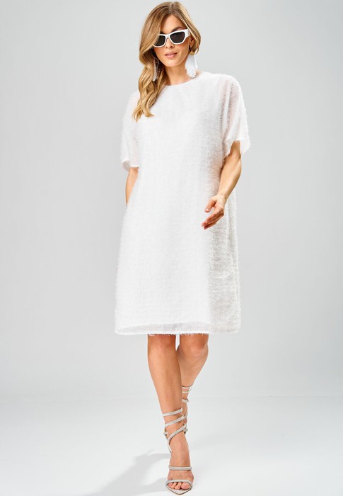Платье женское нарядное из фактурного шифона с эффектом травки, свободного силуэта, на подкладке, длиной до коленей, с цельнокроенными рукавами. Деталь спинки платья со средним швом, с «V-образным» вырезом, в который вставлена планка для протяжки декоративного элемента. Длина плеча - 37см, ширина проймы – 20см, длина спинки – 78см.