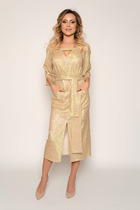 Платье отрезное по линии талии, округлой горловиной. Полочка состоит из центральной детали и вертикальных рельефных бочков, переходящих в цельнокроеные рукава укороченной длины. Длина рукава по плечевому шву от края горловины 31 см.