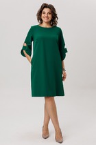 Платье создано из струящейся плотной сатиновой группы, отрезное по линии талии и притачной юбкой кроя «полусолнце». Лиф платья отрезной с фиксируемыми по талии сторонами на запах. В плечевых швах и линии талии заложены модельные складки. Горловина изделия по спинке имеет незначительную стойку 2 см, переходящую на полочку в углубленный V-образный вырез. Рукав втачной, одношовный, имеет деликатное расклешение. Длина рукава 42-43 см. Юбка изделия покроя «полусолнце», на линии талии со стороны спинки и полочки две модельных складки, в одной из которых на переднем полотнище, слева, расположен открытый разрез, высотой 44 см. В левом боковом шве размещена застежка на потайную молнию. Платье дополнено съемным текстильным поясом.