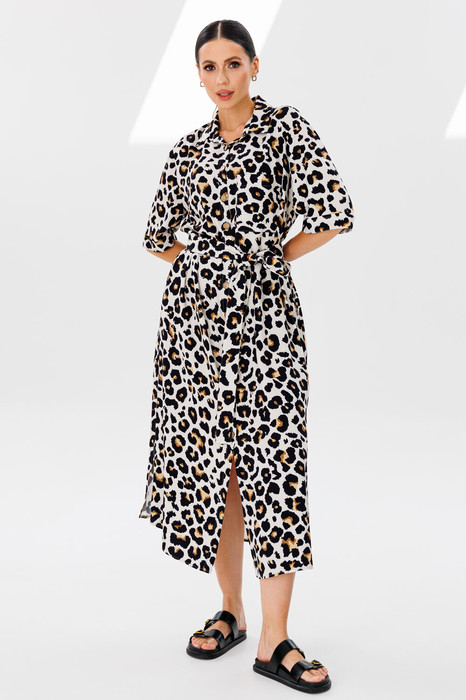 На полочках-горизонтальные нагрудные вытачки, слева нагрудный карман прямоугольной формы. В боковых швах: внутренние карманы и открытые разрезы, высотой 39-41 см. Спинка платья имеет горизонтальную кокетку, высотой 14,5 см. По центру переда цельнокроеные планки на функциональную застежку петли/пуговицы. Горловина обработана воротником рубашечного типа на стойке. Рукав втачной, одношовный, с цельнокроеной манжетой. Длина рукава 33-34 см (в зависимости от размерного ряда). Длина изделия по спинке 127 см. Для подчеркивания линии талии прилагается съемный текстильный пояс, шириной 4,5 см.
