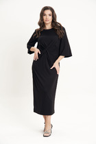 Нарядное черное платье А-силуэта – визуально вытягивает фигуру, не подчеркивая талию и придает изящность. Материал средней плотности из костюмно-плательной ткани с мерцающим эффектом. Вырез горловины округлый, в боковых швах предусмотрены карманы. Рукав вточной, с заложенными складками-за щипами по низу. Спинка с декоративным вырезом и застежкой на петлю и пуговицу. Изюминкой данной модели является шикарная аппликация в виде декоративного цветка – орхидеи украшенного бусинами и жемчугом.