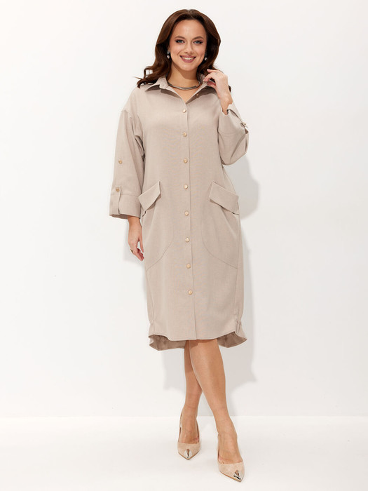 Платье свободного силуэта со спущенной линией плеча. Воротник рубашечного типа на стойке. Центральная застёжка на петли и пуговицы. По передним половинкам платья накладные карманы с цельнокроеным клапаном. Низ платья фигурный. Спинка платья чуть длиннее переда, по низу обработана обтачкой. Низ присборивается на шнур из основной ткани, таким образом формируя желаемый силуэт платья. Рукав двухшовный. Низ рукава на притачной манжете с патой. По верхнему центральному шву рукава пришиты две пуговицы, что позволяет регулировать длину рукава.